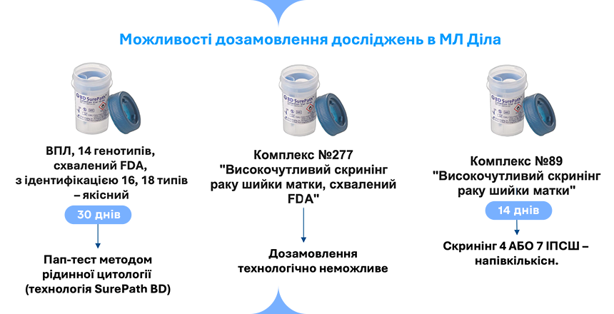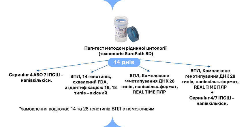 1. З матеріалу Пап-тест методом рідинної цитології (технологія SurePath BD) дозамовлення ПЛР-досліджень можливе протягом 14 днів із моменту взяття біоматеріалу. У межах цієї послуги можна замовити: