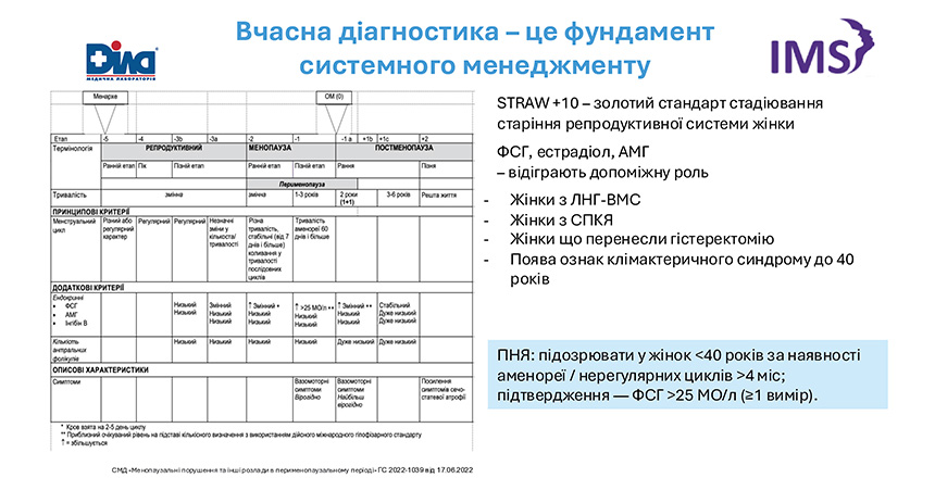 Загальні принципи клінічної оцінки симптомів та визначення стадії репродуктивного старіння залишаються без змін. Особливу увагу керівництво приділяє передчасній недостатності яєчників (ПНЯ), та ранній менопаузі, адже своєчасна та ефективна діагностика з наступним призначенням менопаузальної гормональної терапії (МГТ) безсумнівно сприяє покращенню соматичного та психічного здоров’я, а також загального благополуччя пацієнтки.