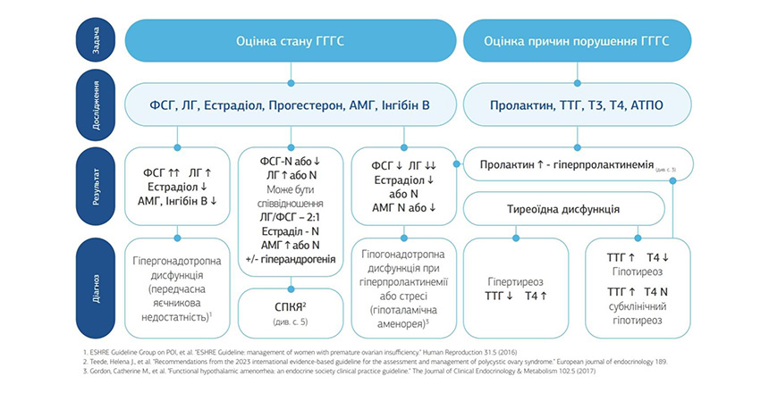 Поєднання показників показників Фолікулостимулюючий гормон (ФСГ), Лютеїнізуючий гормон (ЛГ), Естрадіол (E2), Пролактин, Інгібін В, Антимюллерів гормон (АМК), Тиреотропний гормон (ТТГ), Т3, Т4, АТПО допомагають диференціювати порушення гіпоталамо-гіпофізарно-гонадної осі, гіперпролактинемію, гіпотиреоз та передчасну недостатність яєчників.