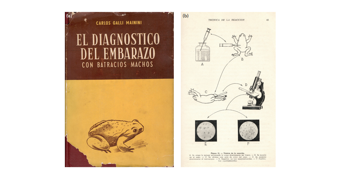 Обложка монографии Галли Майнини о тесте на беременность с помощью самцов жаб. И диаграмма из той же книги, иллюстрирующая этапы проведения теста и два возможных результата
