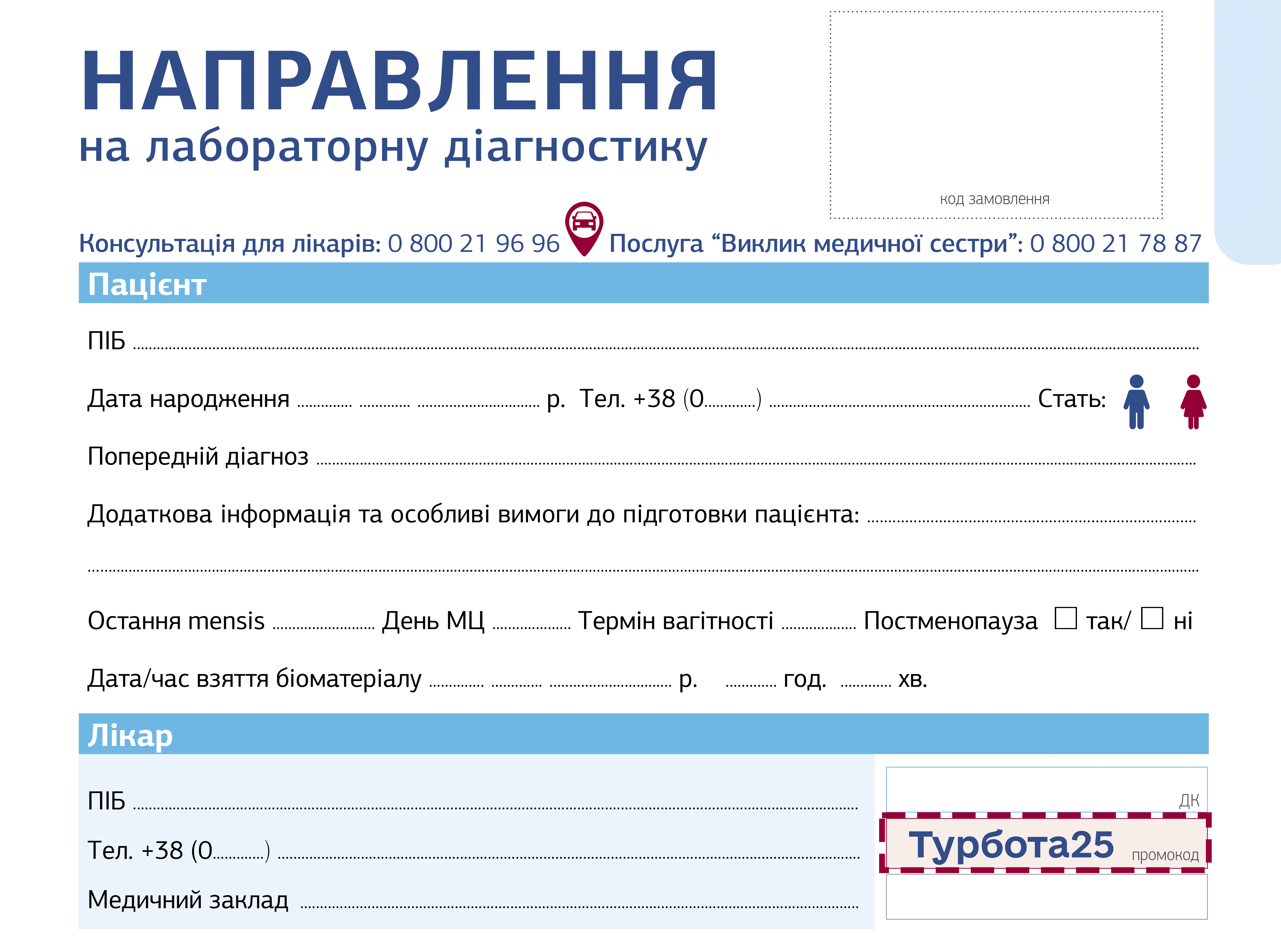 Сформуйте пацієнту направлення на обстеження в Діла на стандартному паперовому бланку Діла та вкажіть у спеціальному полі для промокоду «Турбота25» і код або телефон лікаря.